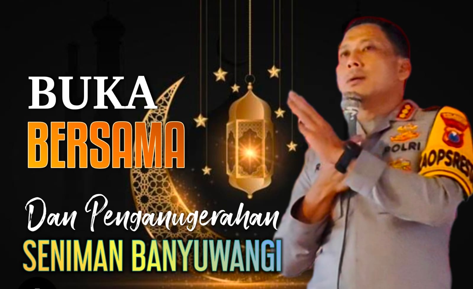 “Kemasan Buka Bersama Seniman dengan Kapolresta Banyuwangi pada hari Selasa, 25 Maret 2025 dimulai Pukul 15.00 WIB di gedung utama Studio One Nada Cempokosari Cluring Banyuwangi, niscaya akan menjadi ajang silaturahmi yang mengesankan. Karena selain Kapolresta Kombes Pol Rama Samtama Putra akan berbagi tali asih, juga akan dibarengi Penganugerahkan Apresiasi terhadap 70 seniman yang telah berjasa terhadap Kabupaten Banyuwangi“
