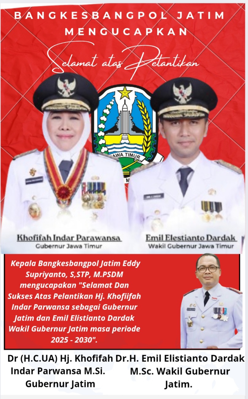 Untuk itu, Kepala Bangkesbangpol Jatim Eddy Supriyanto, S,STP, M.PSDM mengucapakan “Selamat Dan Sukses Atas Pelantikan Hj. Khofiifah Indar Parwansa sebagai Gubernur Jatim dan Emil Elistianto Dardak Wakil Gubernur Jatim masa periode 2025 – 2030″.