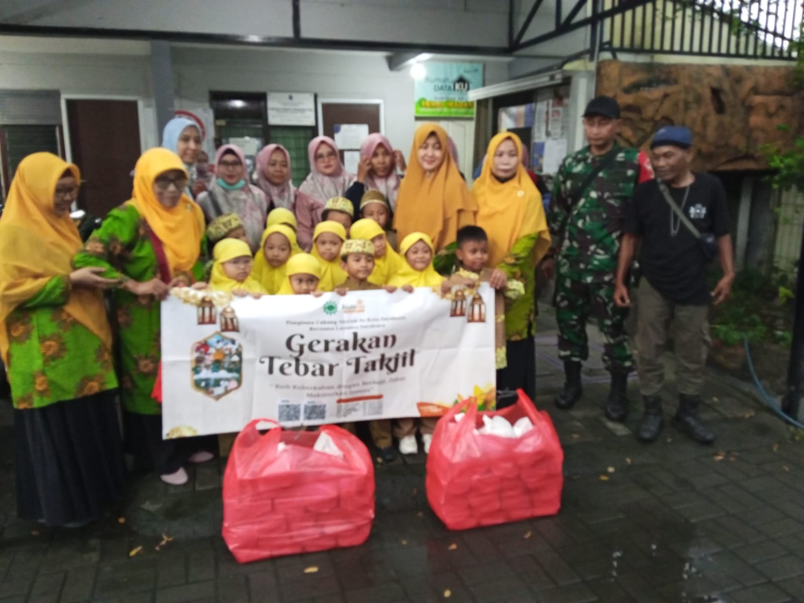 Anak-anak menyerbu ke jalan sambil membawa bingkisan takjil. Tangan-tangan kecilnya, dituntun para guru dan orang tua terlihat sangat antusias membagikan takjil kepada siapapun yang lewat di lokasi pembagian.Kepala Sekolah TK Asyiyah 33 mengatakan pembagian takjil gratis tersebut merupakan kegiatan dari rangkaian Bulan suci Ramadhan TK Asyiyah.